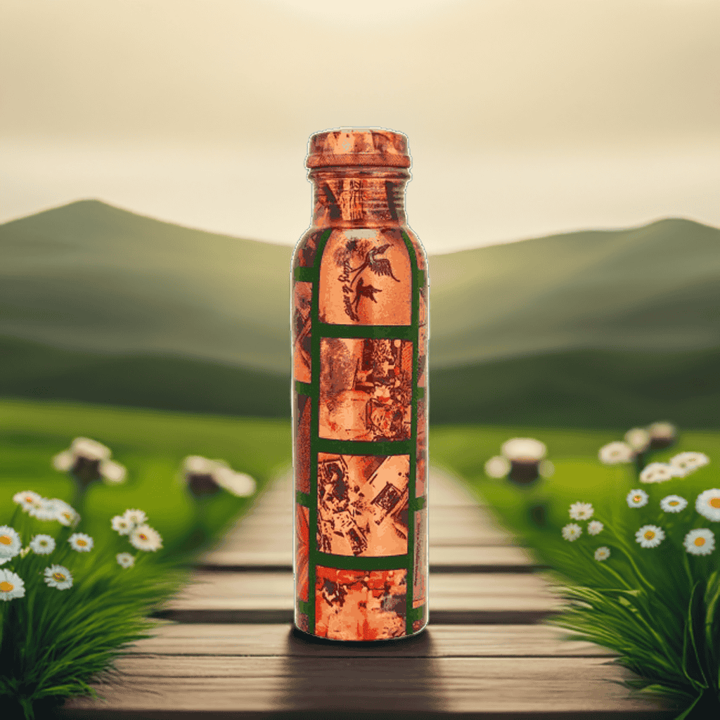 Stay refreshed the healthy way with our Pure Copper Water Bottle with Printing Design and Enameled Finish. Crafted from 100% pure copper. The colorful printed design with an enameled finish gives it a modern vibe while keeping the classic charm of copper. Perfect for home, office, gym, or travel, this 1-liter bottle is perfect for staying hydrated while enjoying the health benefits inspired by ancient Ayurvedic traditions.